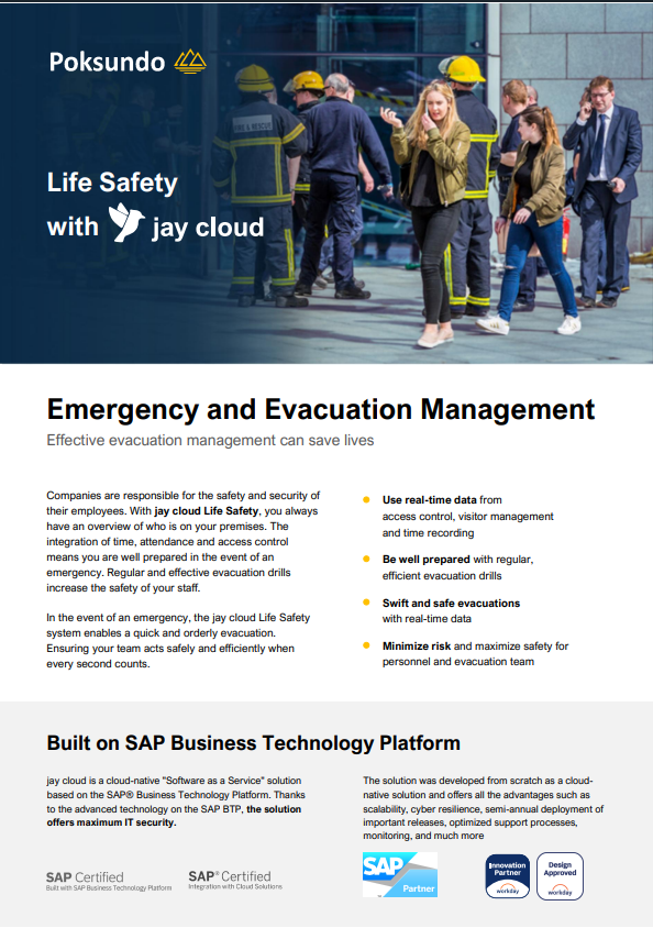 With jay cloud Life Safety, you always have an overview of who is on your premises. The integration of time, attendance and access control means you are well prepared in the event of an emergency. Regular and effective evacuation drills increase the safety of your staff.l.